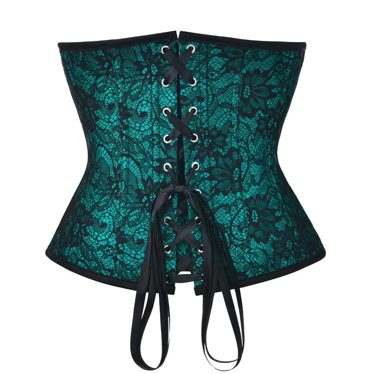 - Stylish green lace underbust corset, it ties up with ribbon at the back for easy adjusting and closes with a zipper on the front.