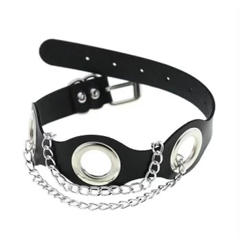 - Faux leather choker with an adjustable buckleΒ fastening and hanging chain.