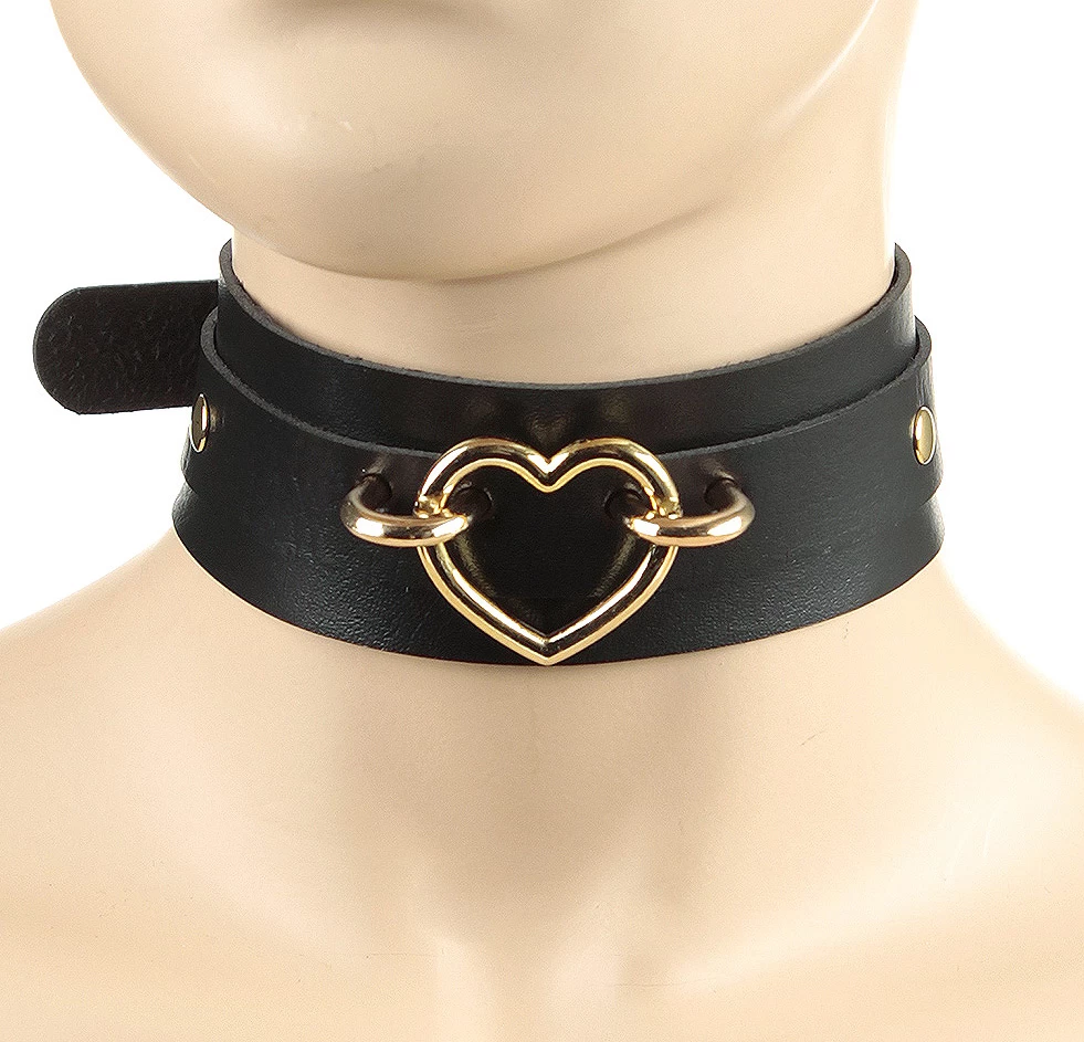 - Black faux leather choker with an adjustable buckle fastening and golden coloured heart.