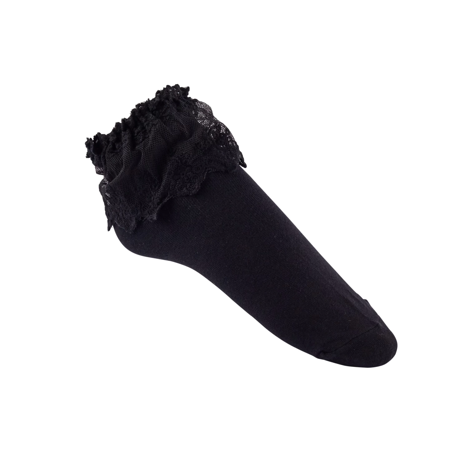 - Black anklet socks with a black lace ruffle detail.