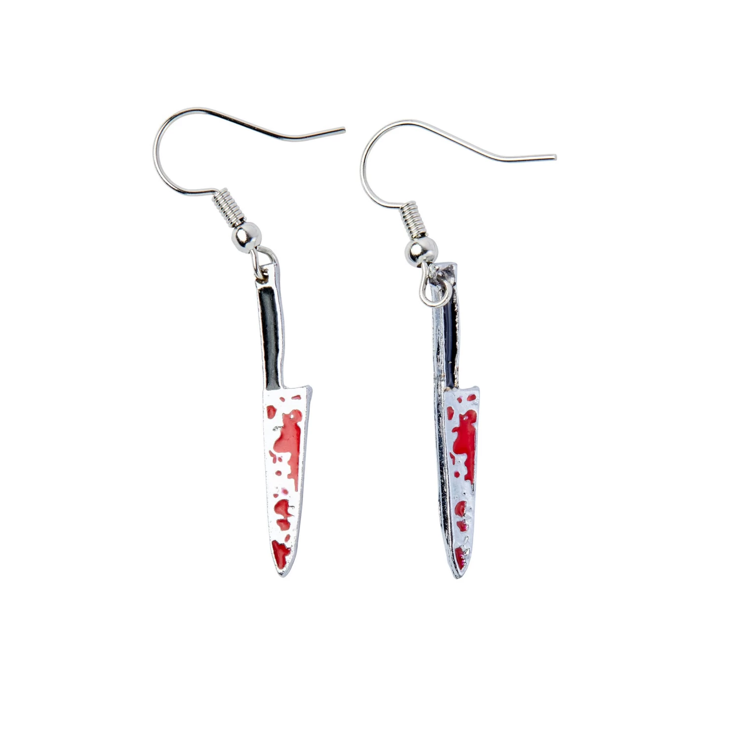 - A cool pair of knife earrings with blood stains, perfect for a steampunk, gothic or halloween aesthetic.