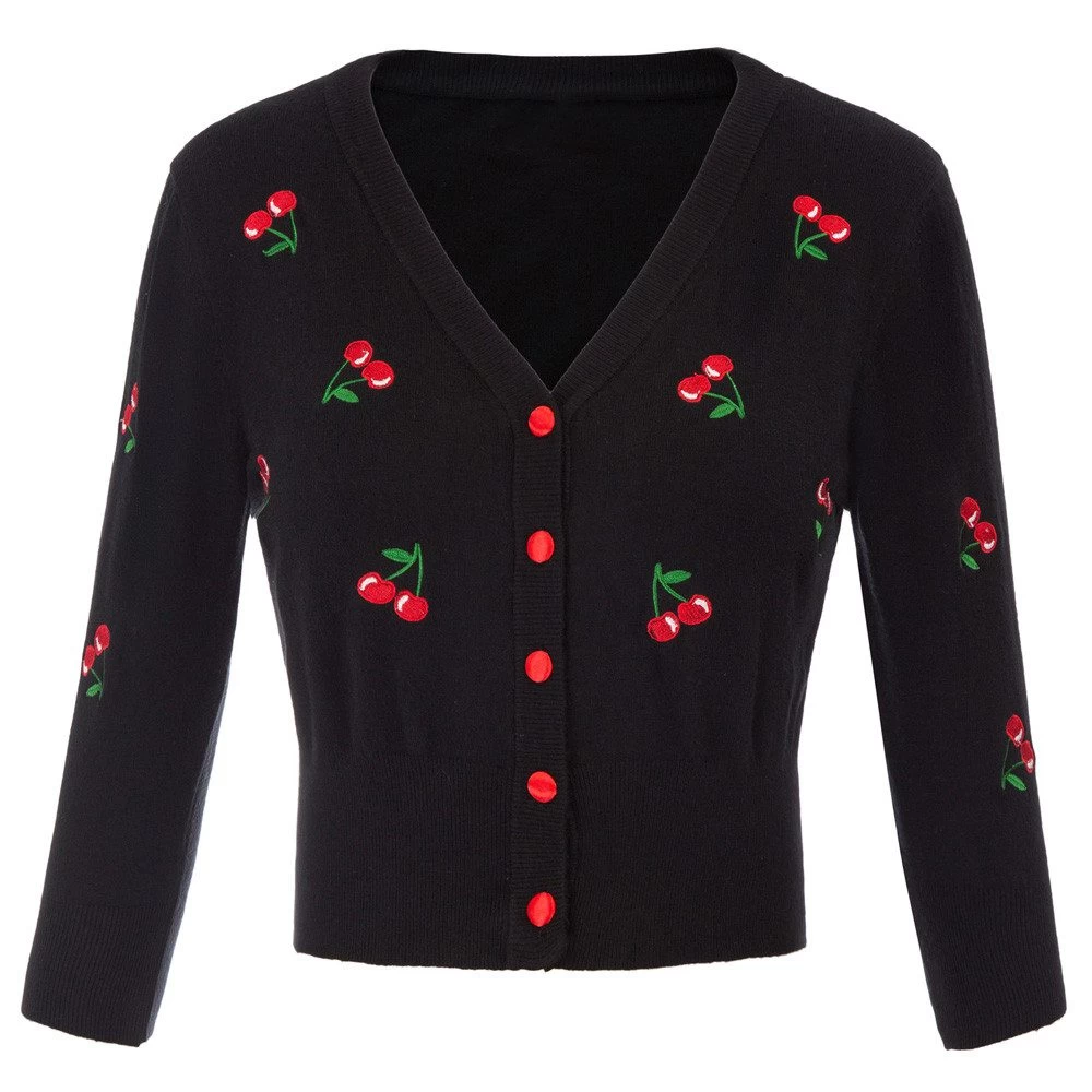 - Add some sweetness to your wardrobe with this cherry print cardigan. This cozy knit features cute red cherries on the front. The cardigan has a v-neckline, long sleeves and button closures. This cardigan perfect for layering over your favourite tops and dresses.