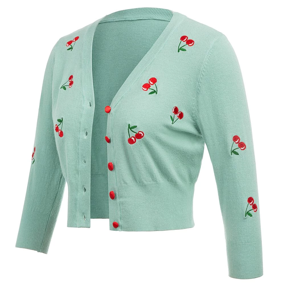 - Add some sweetness to your wardrobe with this cherry print cardigan. This cozy knit features cute red cherries on the front. The cardigan has a v-neckline, long sleeves and button closures. This cardigan perfect for layering over your favourite tops and dresses.