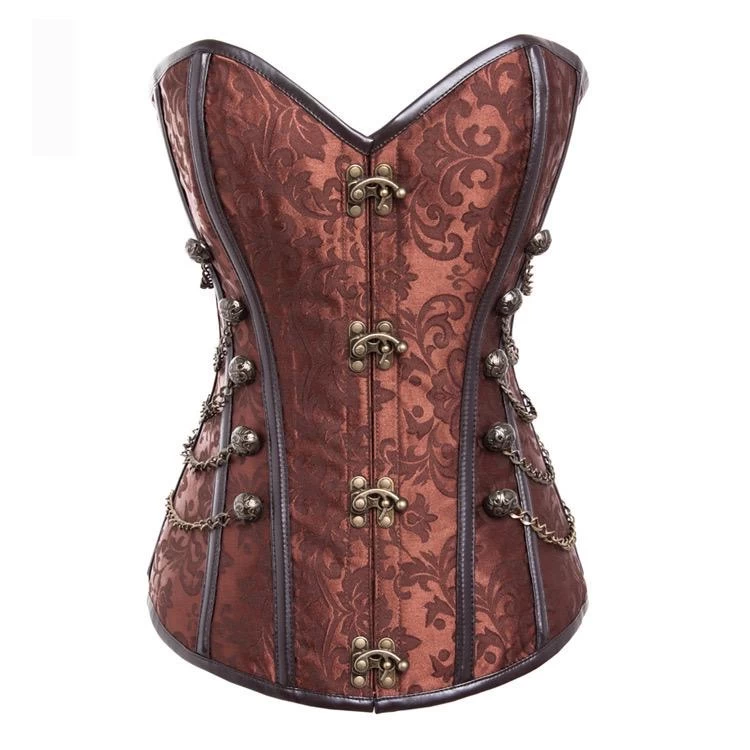 - Stylish brown patterned corset. Silver chain with button detail on side of corset.Β