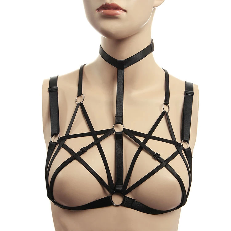 - Gorgeous black body harness with pentagram stars. Tie with hooks on the back and neck. The material is stretchy and suitable for all sizes!