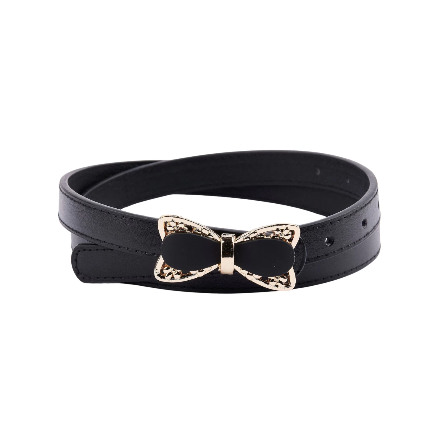 - Super cute belt in faux leather material with metal bow with a gold decoration. Belts come in one size but is adjustable along the belt.