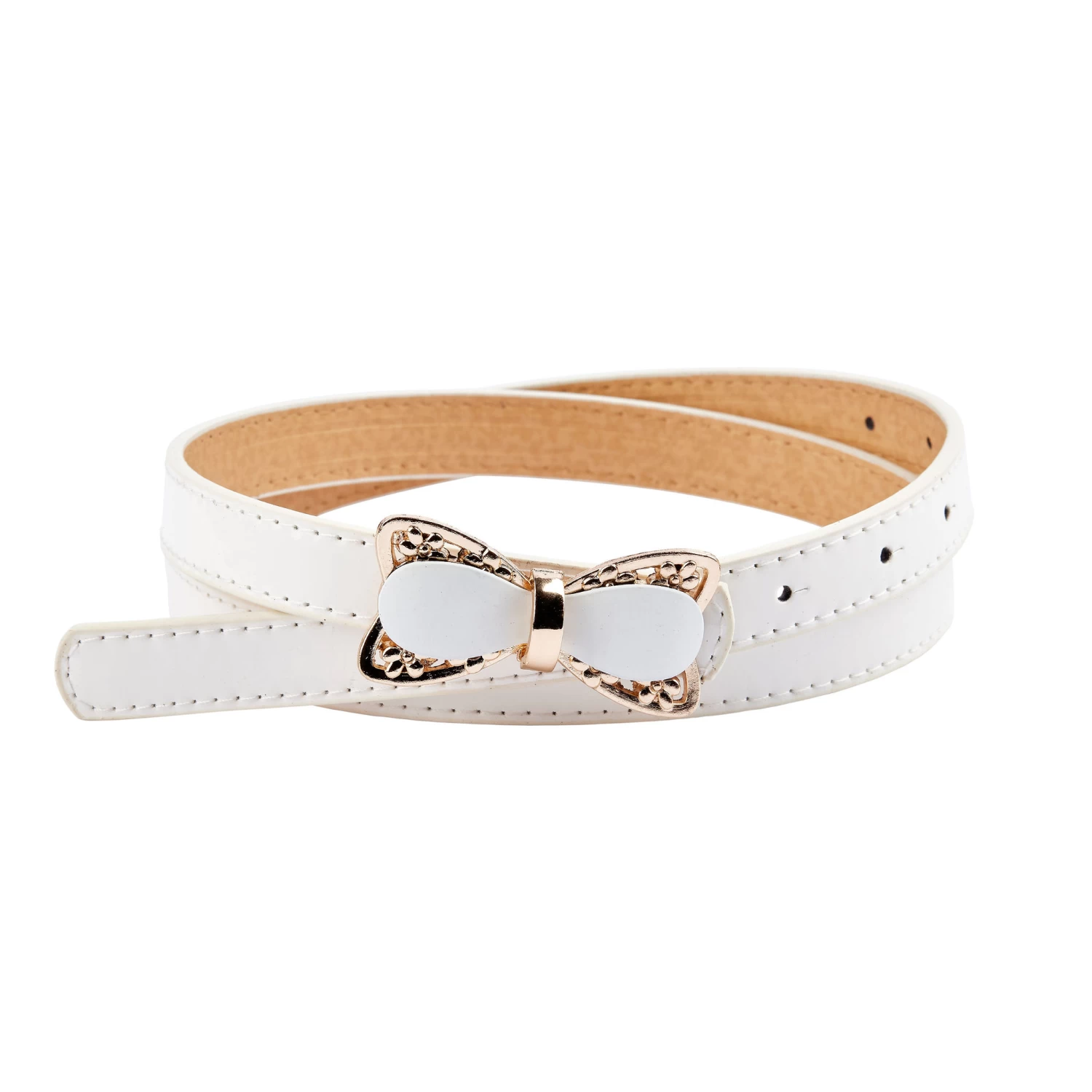 - Super cute belt in faux leather material with metal bow with a gold decoration. Belts come in one size but is adjustable along the belt.