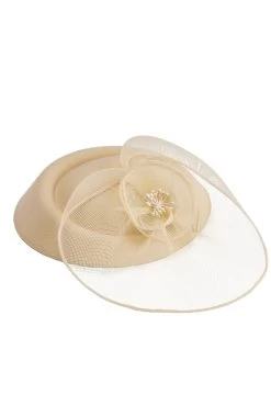 - A circular fascinator with a large white ornimant at the back.