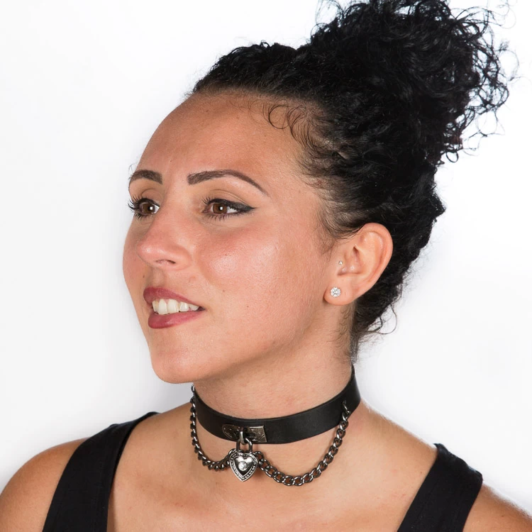 - Leather choker with heart locket and chains.