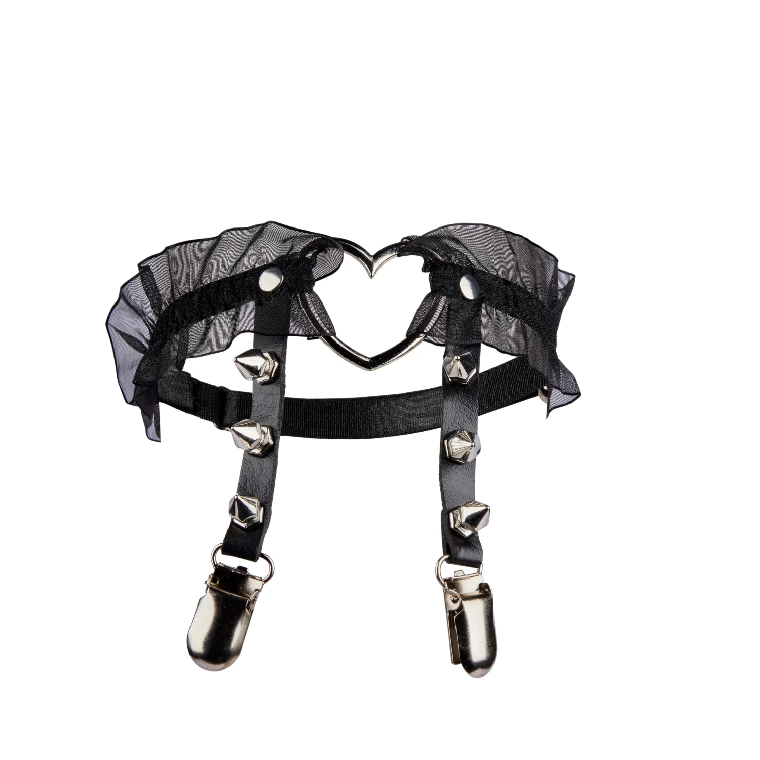 - Stylish garter with studs, metallic heart, beautiful ruffles and clips for stay ups. Garter has a flexible rubber band and is adjustable.