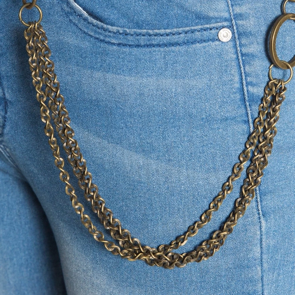 - Bronze with 3 chains with small links and a ring at one end.