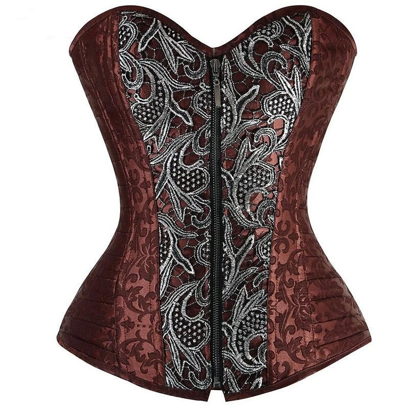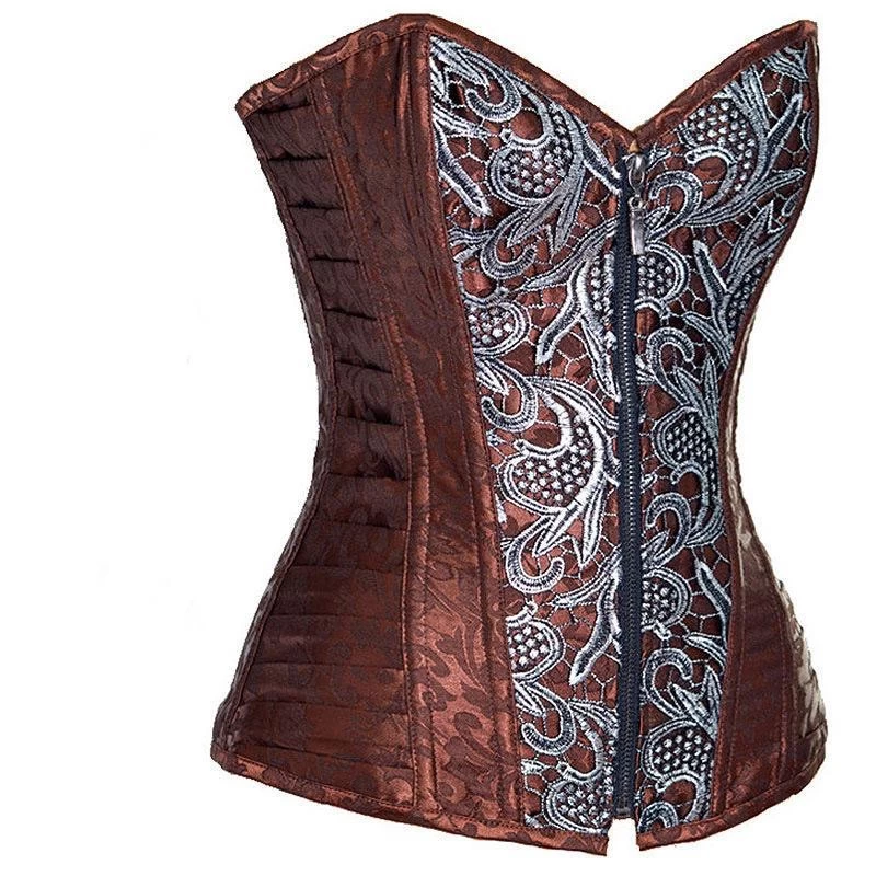 - Stylish brown patterned corset. Silver lace panel on front of corset.