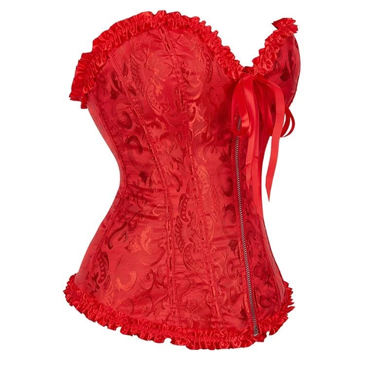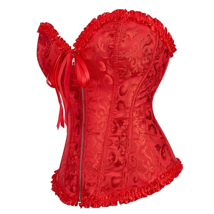 - Stylish pink patterned corset, it ties up with a pink ribbon at the back for easy adjusting and closes with a silver zipper on the front. You can also make a bow with ribbon on the bust.