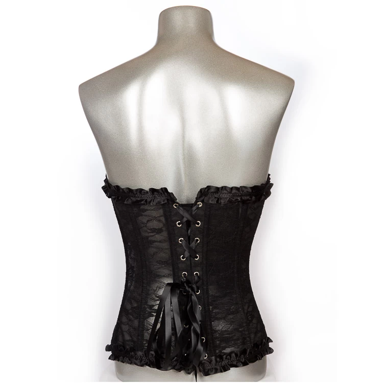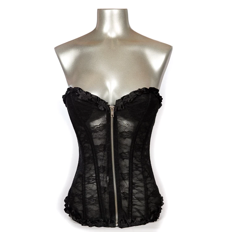 Stylish full black lace corset, it ties up with ribbon at the back for easy adjusting and closes with a zipper in the front.
