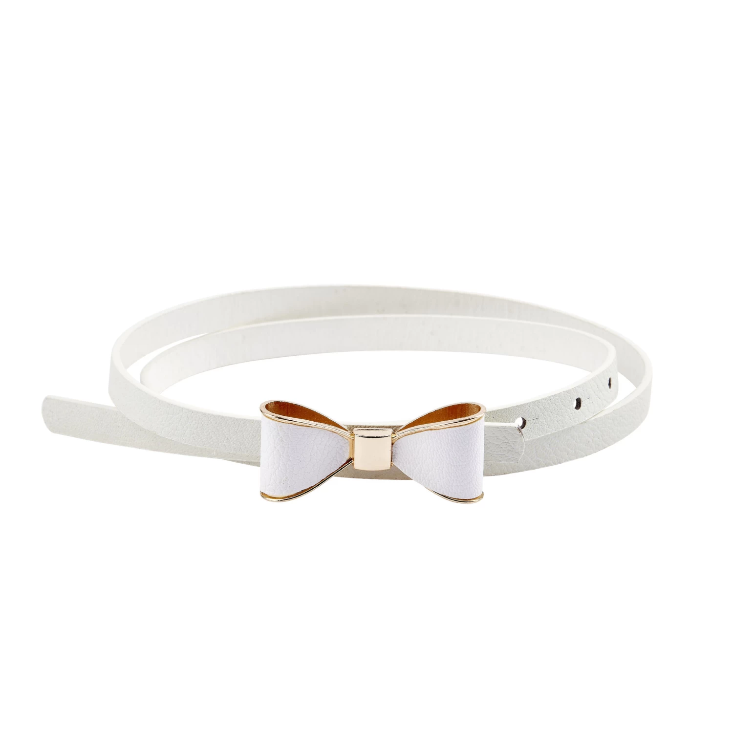 - Super cute belt in faux leather material with metal bow with a gold trim. Belts come in one size but is adjustable along the belt.