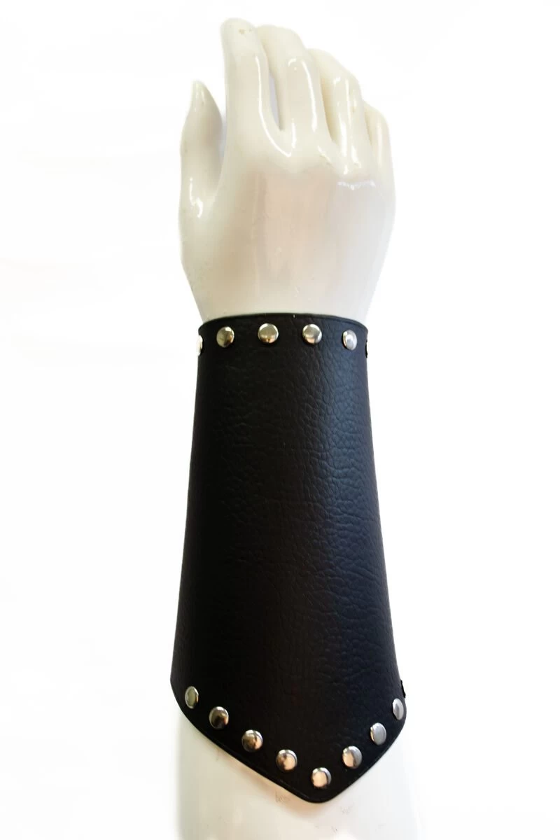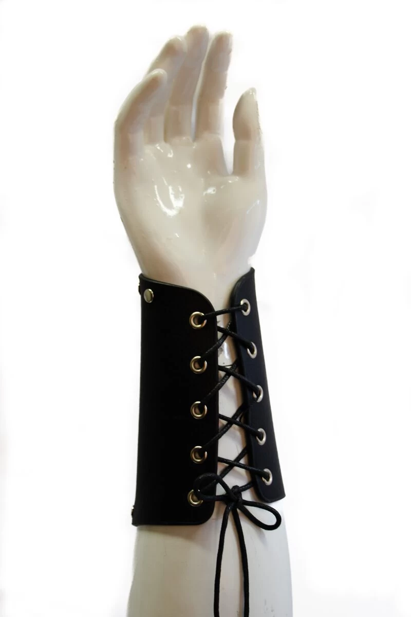 - Black, artificial leather wristband with strings and stylish rivets.