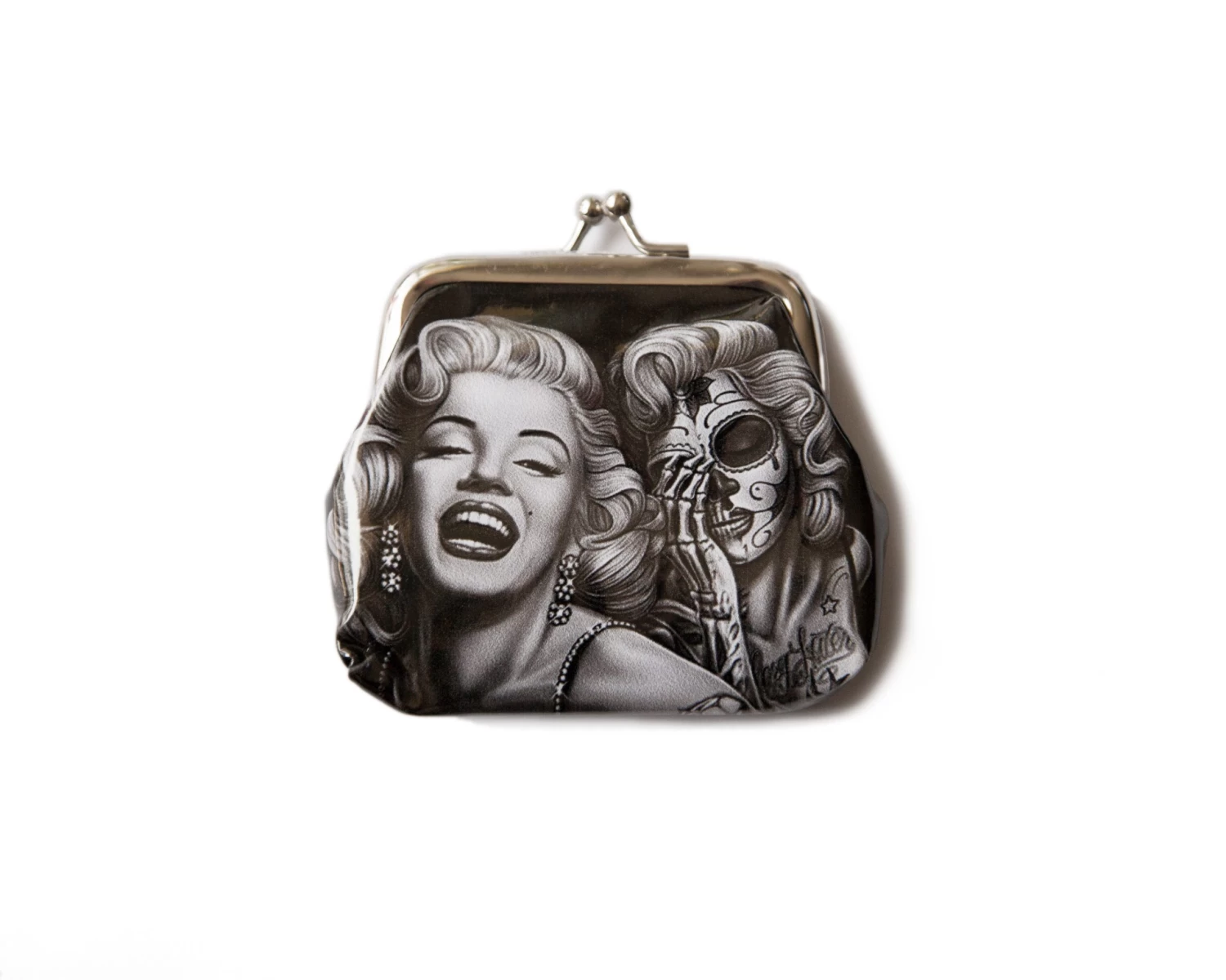 A cute coin purse with a Marilyn Monroe and skull print.