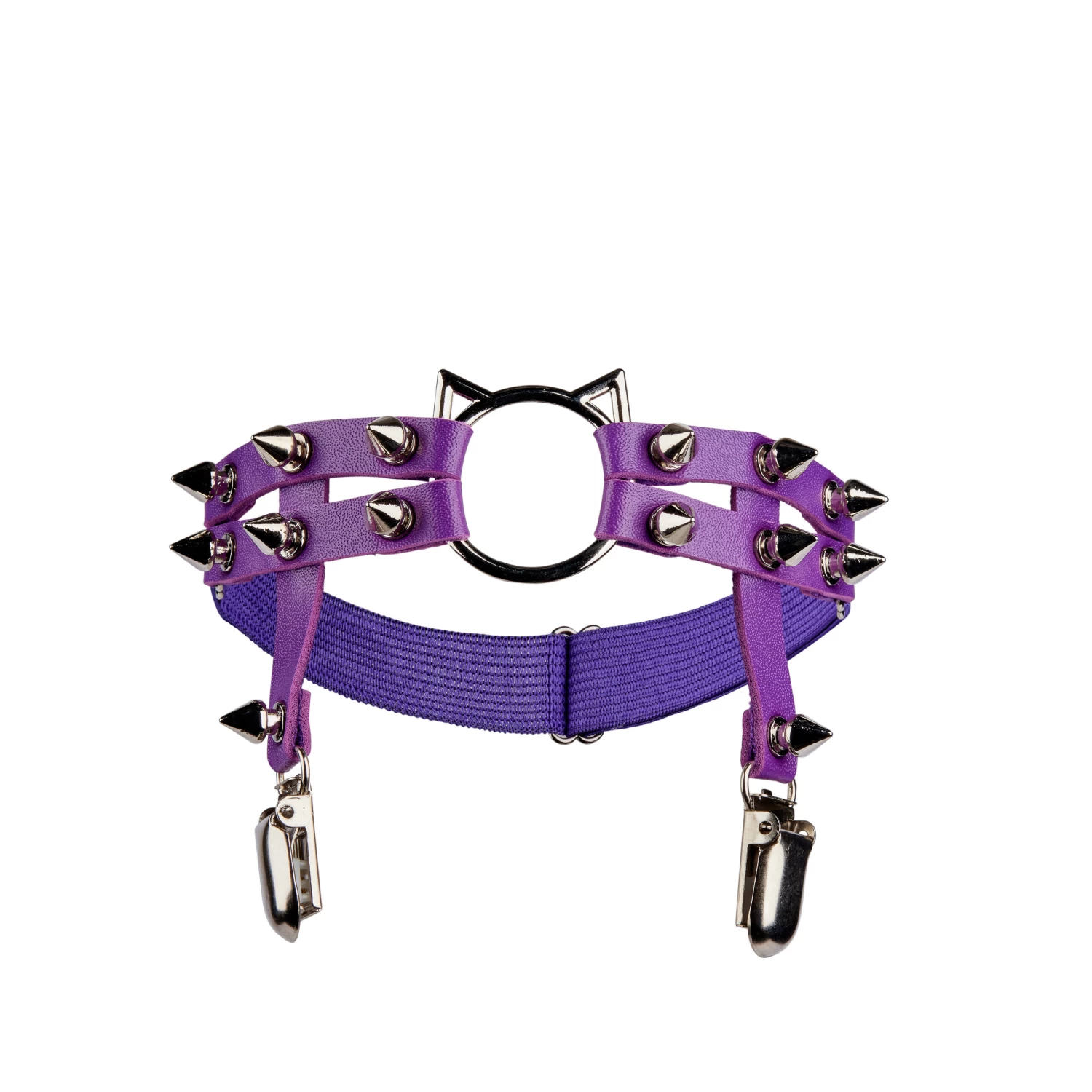 - Stylish garter with double studs, metallic cat ornament, and clips for stay ups. Garter has a flexible rubber band and is adjustable.