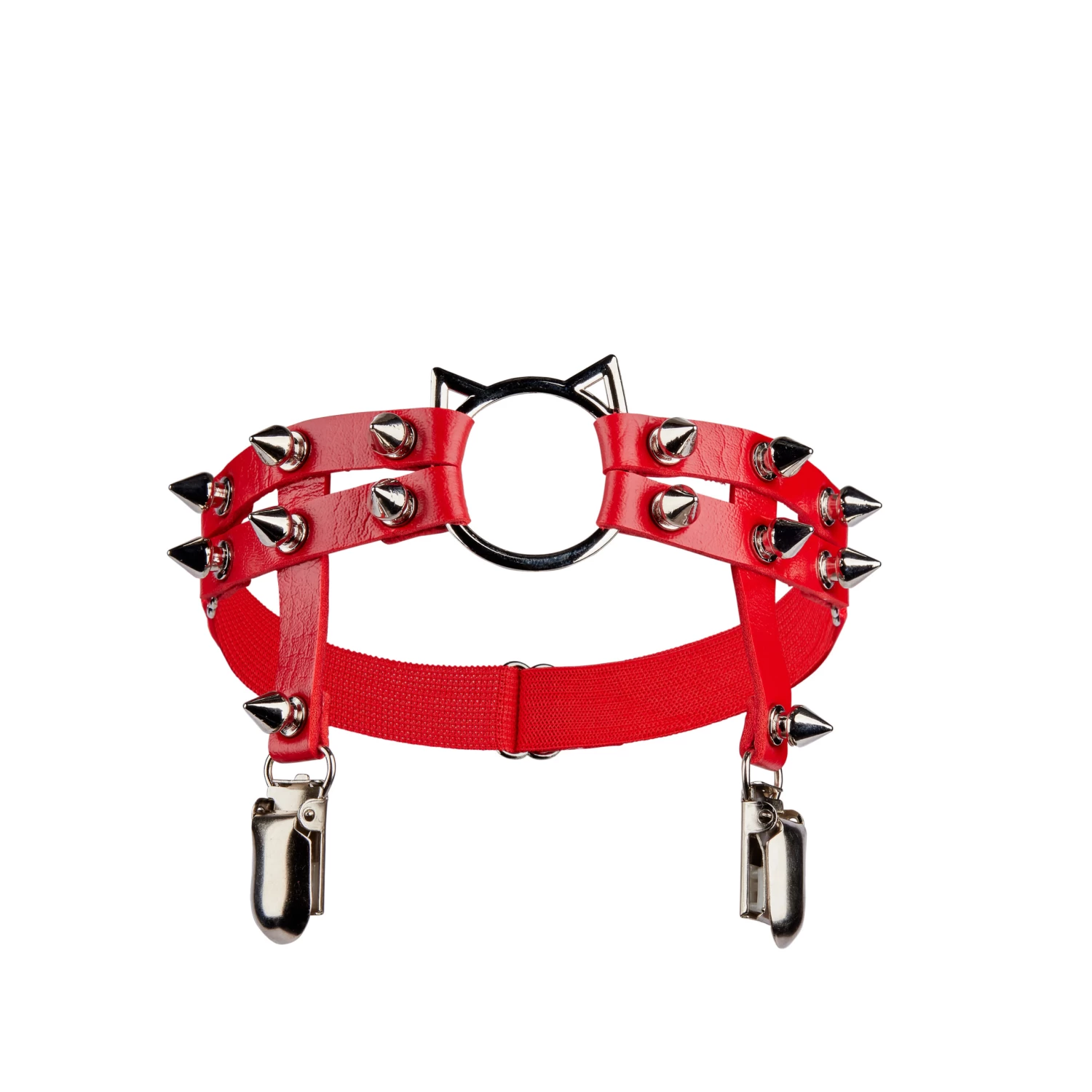 - Stylish garter with double studs, metallic cat ornament, and clips for stay ups. Garter has a flexible rubber band and is adjustable.