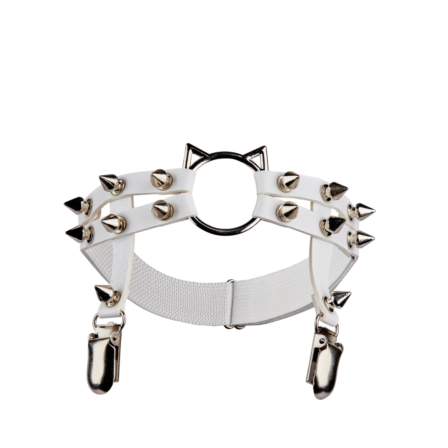 - Stylish garter with double studs, metallic cat ornament, and clips for stay ups. Garter has a flexible rubber band and is adjustable.