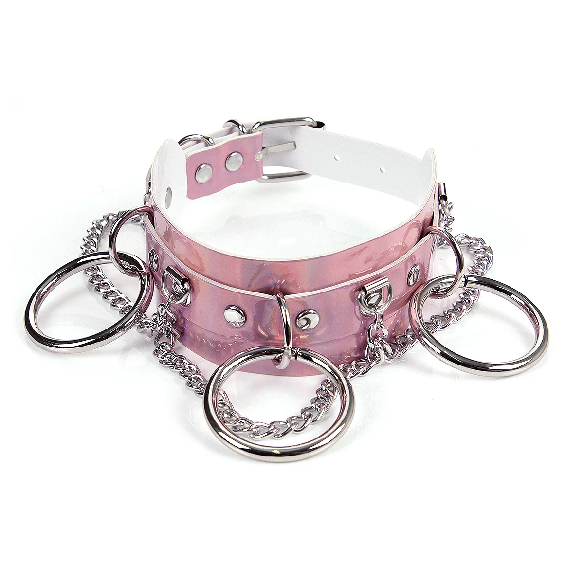 - Cute holographic faux leather choker with an adjustable buckle fastening, big rings and chain.