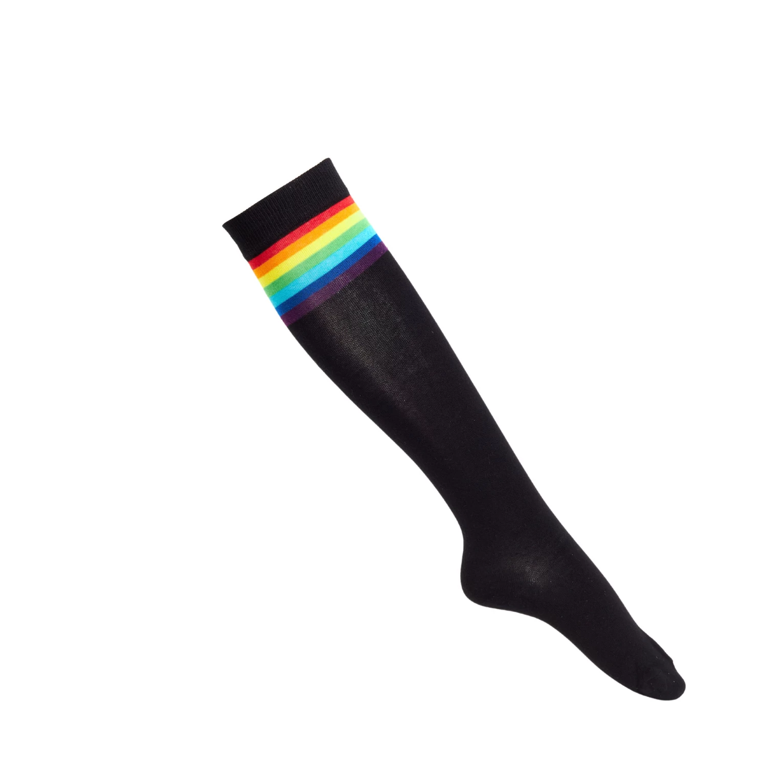 - Black knee high socks with LGBTQ Rainbow Pride Flag Stripe.