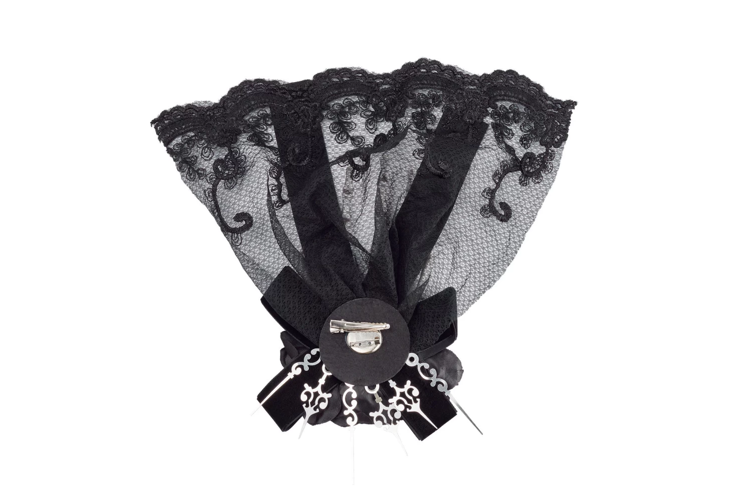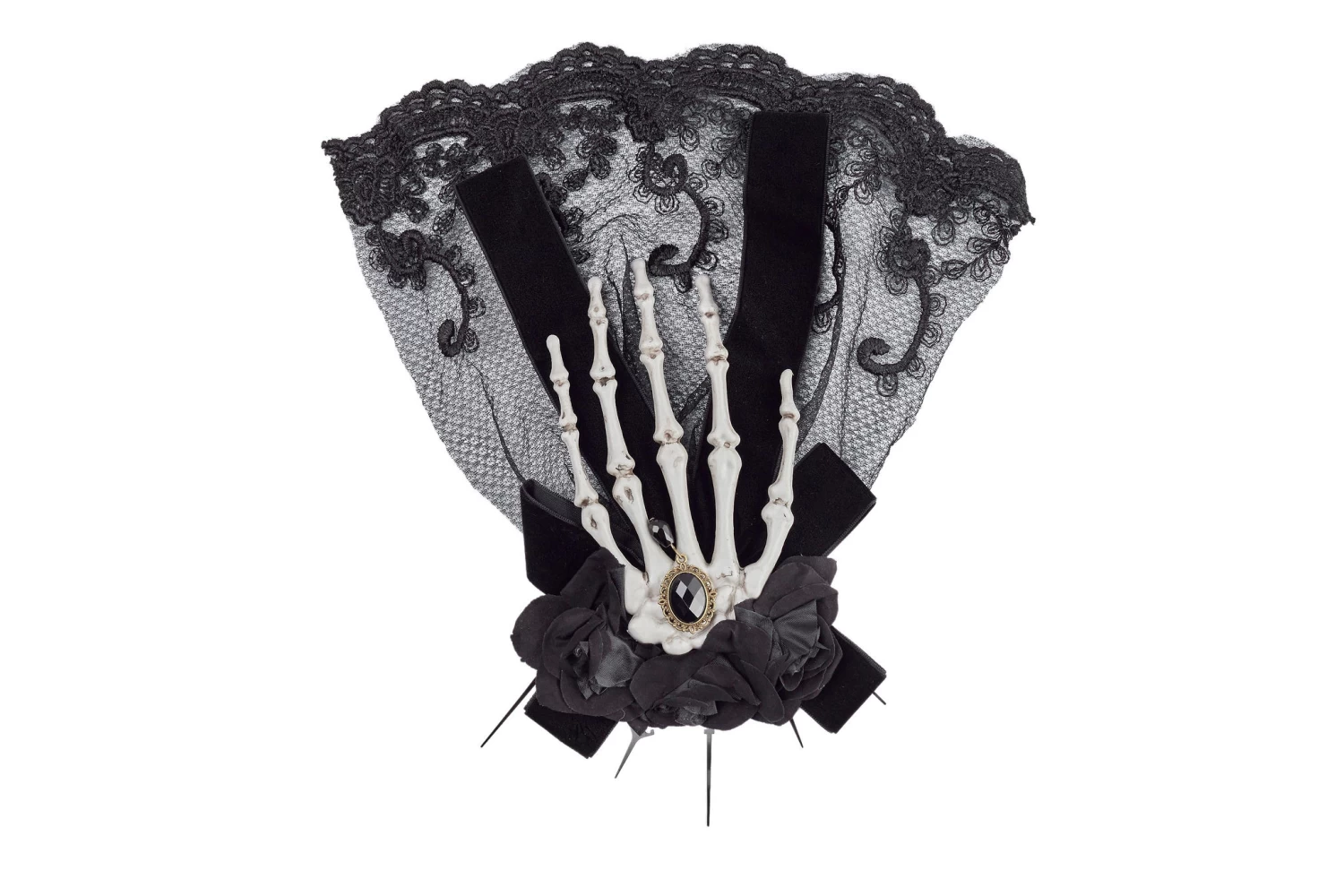 - Large skeleton hand with a lace vail, 3 black roses on the front including a black faux jewel in the middle of the hand.