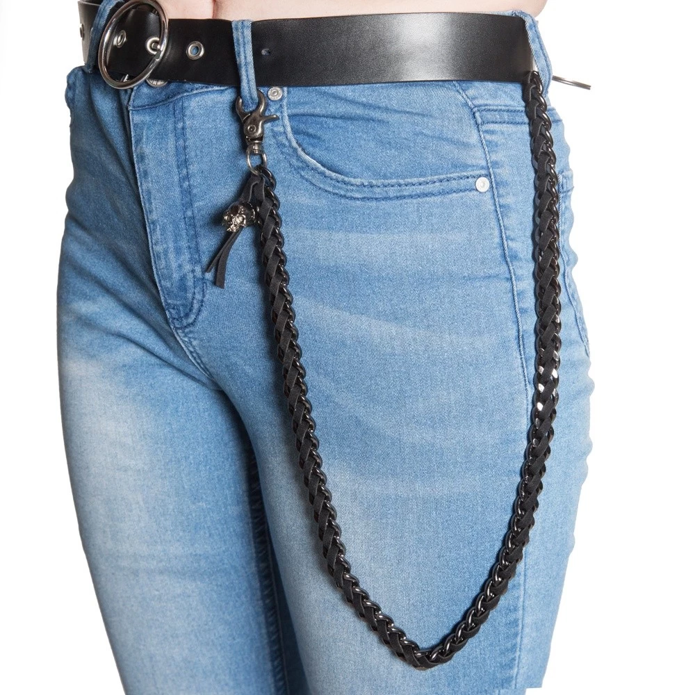 - Pewter colour chain with with black braided rope, including a skull head at the end of the chain.