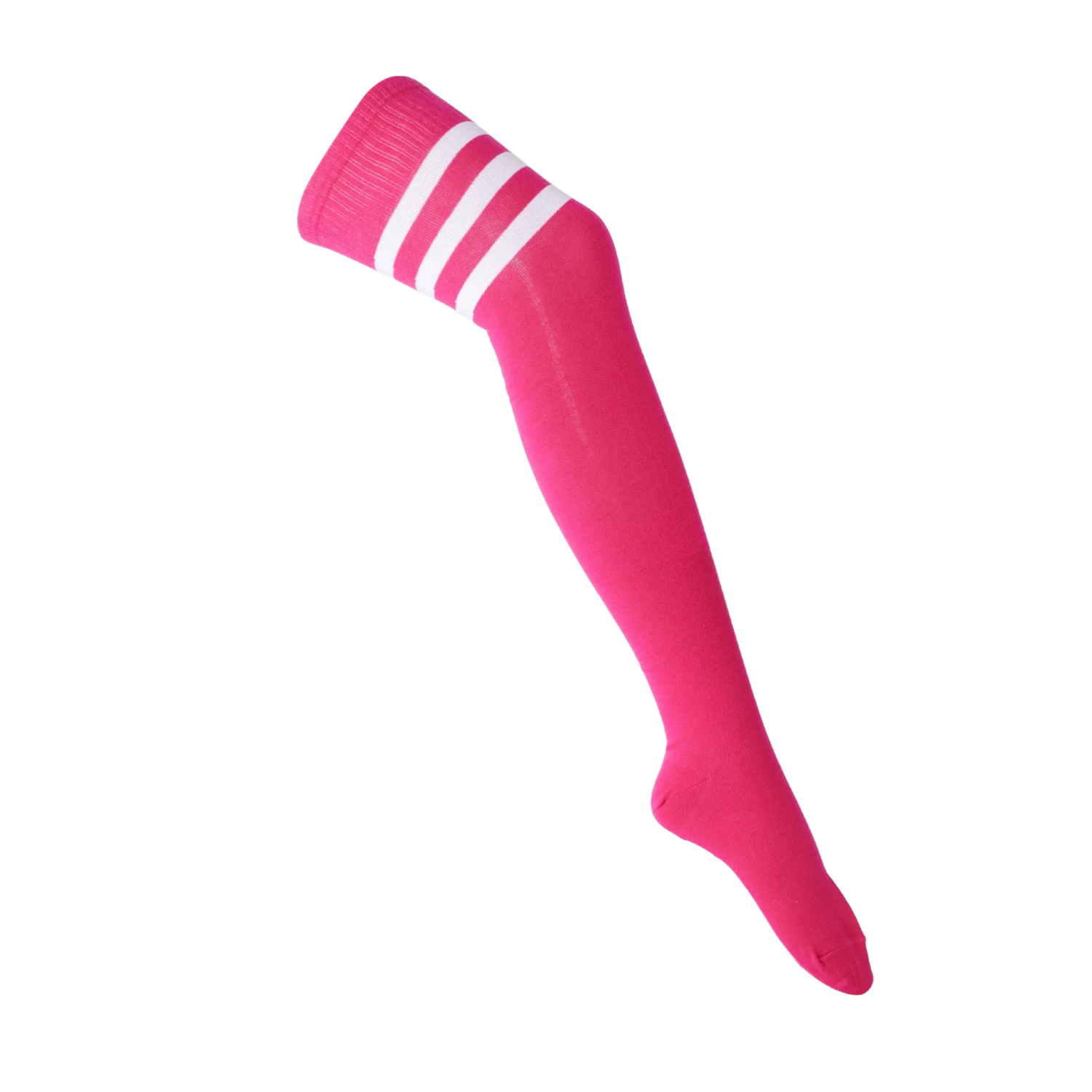 - Stylish pink thigh high socks with three white stipes.