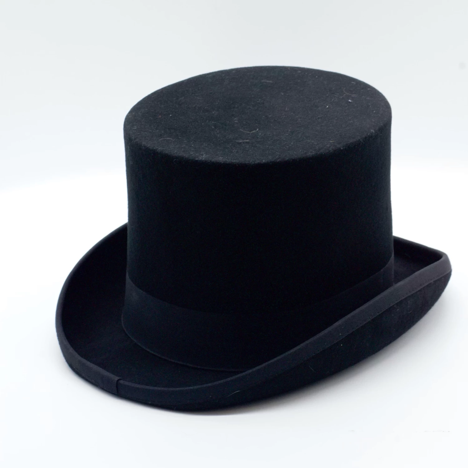 Stylish black top hat with black ribbon around the middle, wear as an accessory to a costume or celebration.