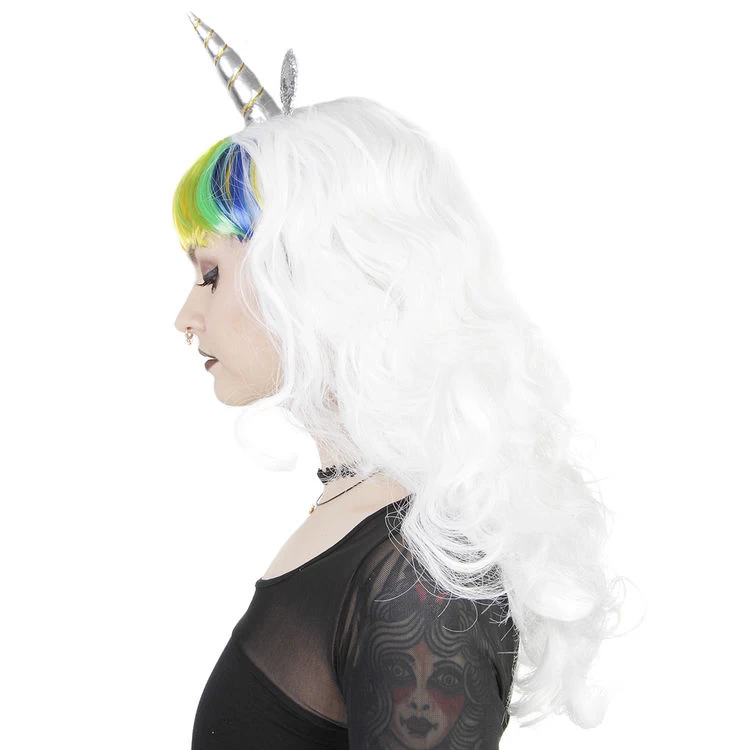 A Long, white wig with rainbow coloured bangs and unicorn horn. Perfect for dress up parties and pride parades.