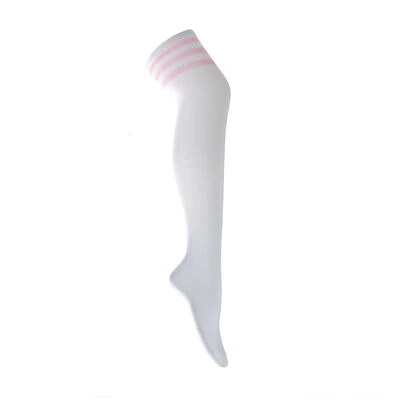 Stylish white knee socks with three pink stripes. One stretchy size.