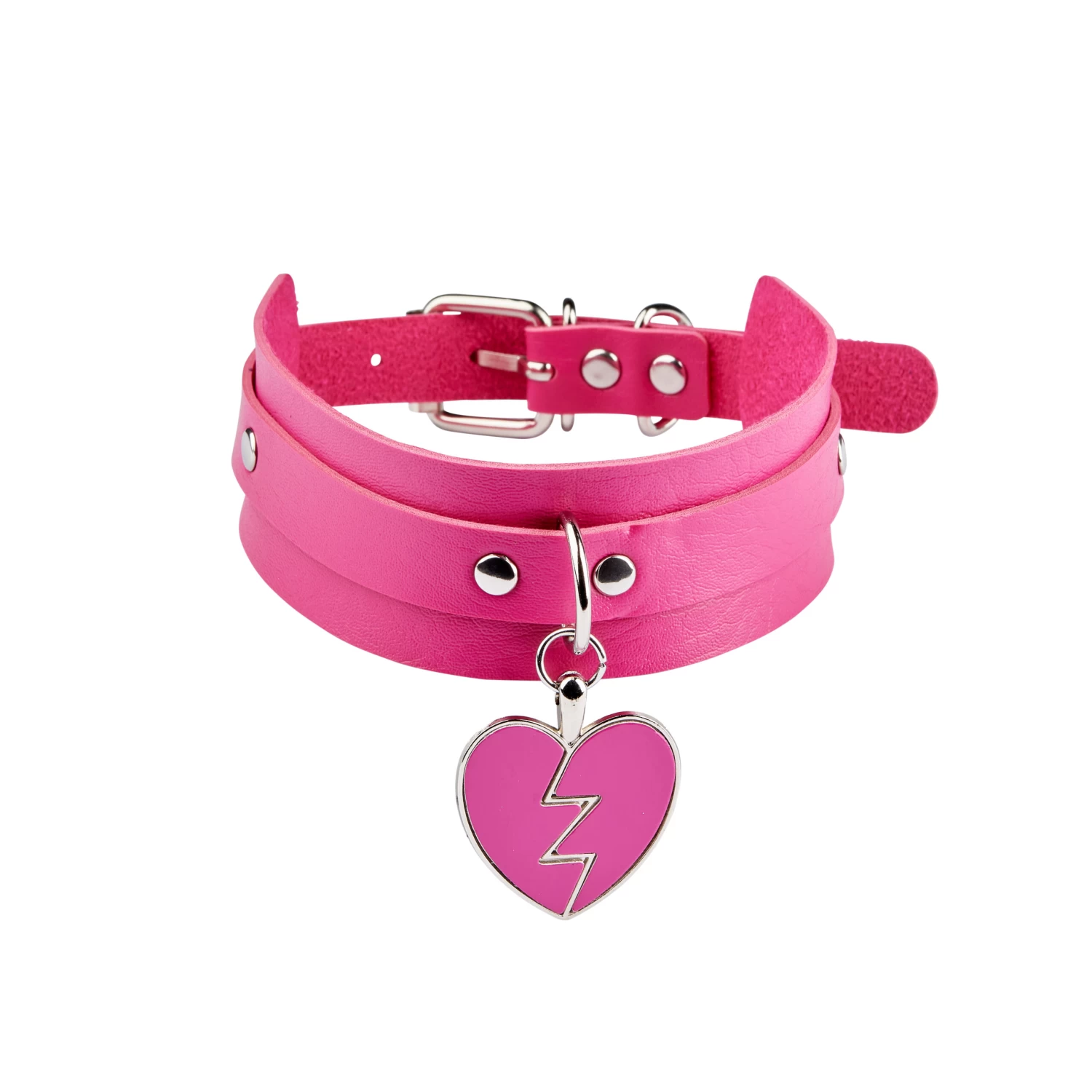 - Dark Pink faux leather choker with an adjustable buckle fastening and broken heart.