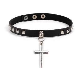 - Thin Black Choker with Pyramid Tiles / Silver Cross