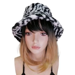 - Fluffy bucket hat. One size. Comes with a drawstring that makes the hat fit even on the smaller head.